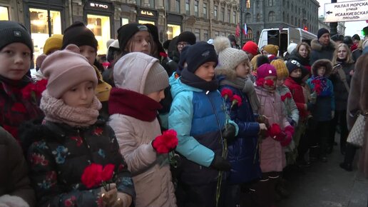 Возложение цветов к мемориальной табличке «Героизму и мужеству ленинградцев» на Невском проспекте