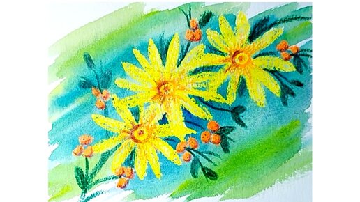 🌼🌿🌼🌿🌼Жёлтые цветы на бирюзовом фоне. Рисунок в смешанной технике.🌼🌿🌼🌿🌼