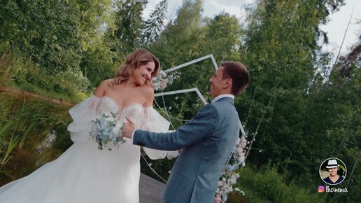Свадьба в загородном доме с панорамными окнами и ухоженным двориком. Церемония на фоне леса и пруда, съемки с коптера и бенгальские огни