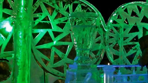 Катушки ледового городка вечером в г. Перми. Смотрите красивые ледовые скульптуры-катушки.