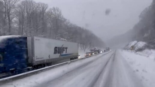 Дальнобойщики сообщают трасса стоит на одну сторону из-за снегопада.