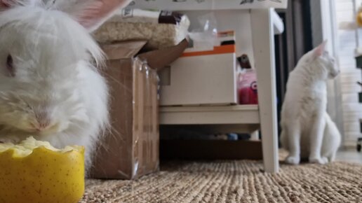 Ангорский пуховка Валерик самозабвенно жуёт яблочко под надзором кота🐱