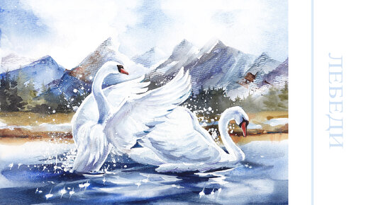 Как нарисовать лебедей акварелью | Пара лебедей на озере среди гор #лебеди #акварелью