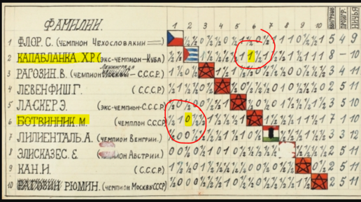 "Экс"чемп Хосе Капабланка взял-таки черными победу у неплохо идущего к своей победе белыми молодого Михаила Ботвинника (Москва, 1936, 0-1)