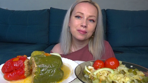 Перец фаршированный. Капуста квашеная с бочковыми огурцами. Мукбанг. Еда.