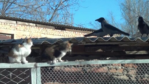 Вороны прогнали котят и съели их корм. The crows chased the kittens away and ate their food