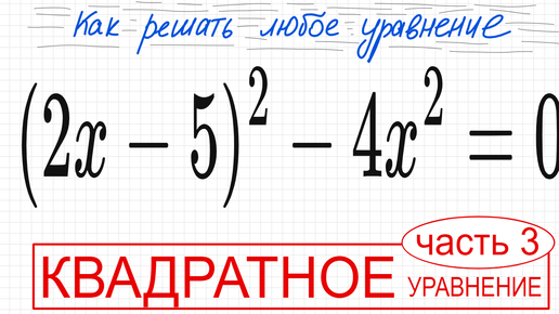 №4 Квадратное уравнение со скобками (2x-5)^2-4х^2=0 Как избавиться от скобок в уравнении Как решить уравнение 8кл 9кл ОГЭ 10кл 11кл ЕГЭ