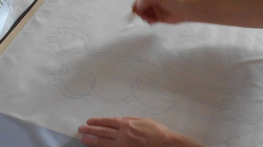 Делаем "батик"! Переносим линии рисунка на ткань! Очень аккуратно, придерживая ткань рукой.