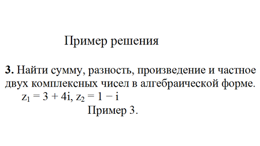 Найти сумму, разность, произведение и частное двух комплексных чисел в алгебраической форме. z1=3+4i, z2=1−i пример 3 Высшая математика