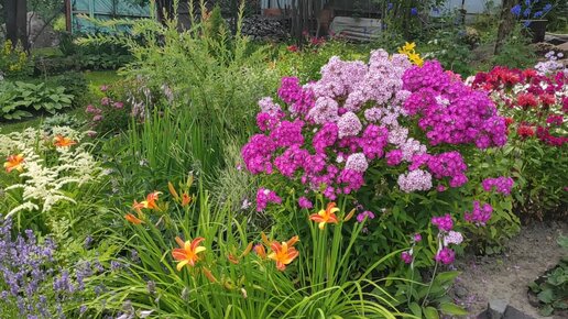 20 июля 2022 года, клумбы нижнего участка. Флоксы, лаванда, гортензия, туи.