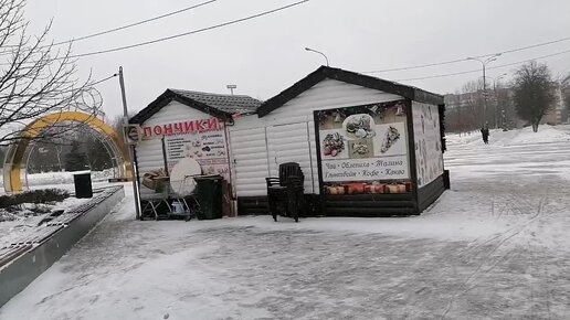 В парке продают пончики и многое другое. Красивая мусорка с названием города. Хороший большой парк
