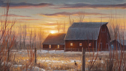 Живопись маслом - Восход солнца и гуляющие утки на фазенде. Мастер-класс по Живописи масляными красками