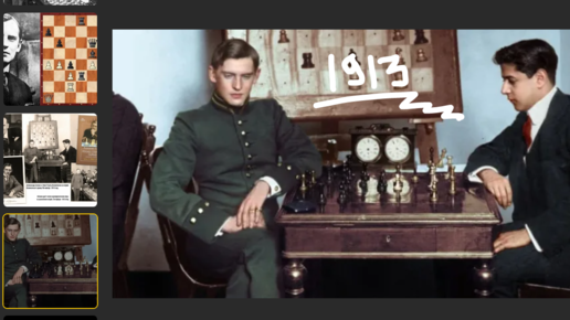 Капабланка ставит нового черного ферзя на доску, и молодой, но амбициозный Алехин, расстроившись, сдается с горя (Петербург, 1913, 0-1)