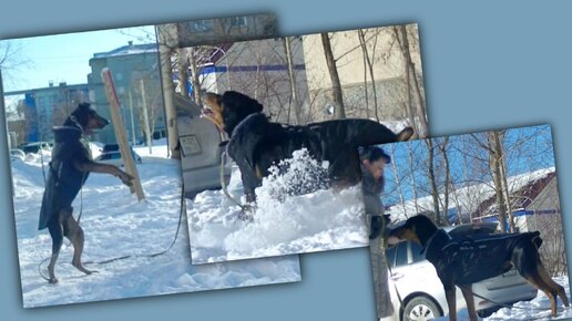 Доберман. Часть нашей прогулки. Лорд не отреагировал на лай собаки и на ее появление родом. Овчарка снова без поводка.