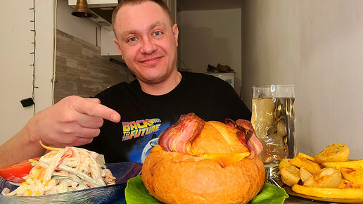 МУКБАНГ. ОБЖОР. ФАСТФУД ДОМАШНИЙ С БЕКОНОМ, ВЕТЧИНОЙ И СЫРОМ И ПОМИДОРАМИ. САЛАТ КРАБОВЫЙ, КАРТОХА. АСМР.