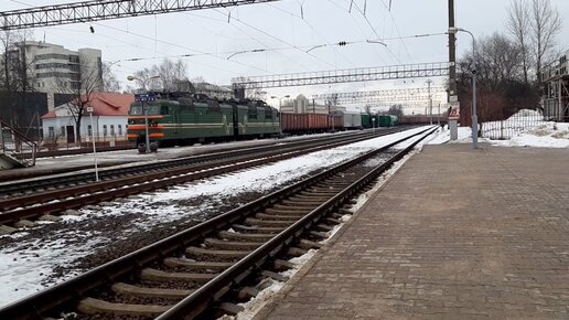 Грузовой под электровозом ВЛ80с синим вагоном Австрийской компании