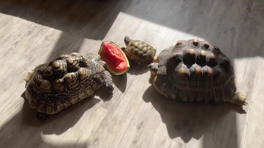 черепахи едят арбуз. милые черепашки. обед для черепахи