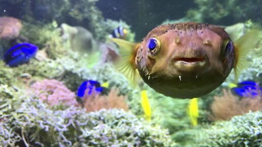 Рыбы-ежи Diodon holacanthus и Cyclichthys orbicularis, кузовок Lactoria cornuta и другие рыбы. Аквариум