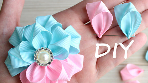 Двухцветные цветки из репсовых лент с необычным лепестком