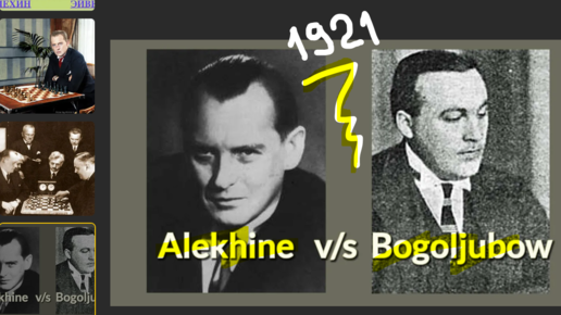 Александр Алехин хорошо играет белыми против "индийской" Ефима Боголюбова. В простом формате переигрывает своего друга (Триберг, 1921, 1-0)
