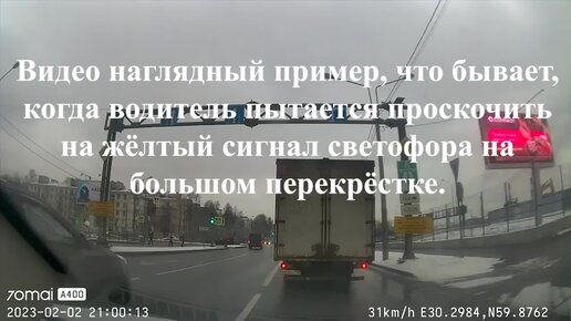 Видео наглядный пример, почему нельзя проезжать большой перекрёсток на жёлтый сигнал светофора.