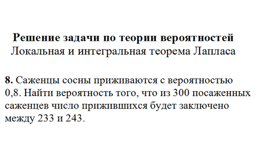 Пример решения задачи на тему локальная и интегральная теоремы Лапласа задача №8 Высшая математика. Теория вероятностей.