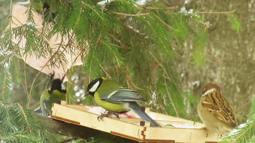 На кормушке в снегопад: Синицы и Воробьи согреваются салом