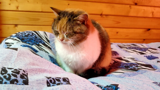 Что делает бездомная кошка, когда мы приезжаем зимой на дачу ее покормить? Накормили кошку вдоволь, а она забралась на кровать и пригрелась