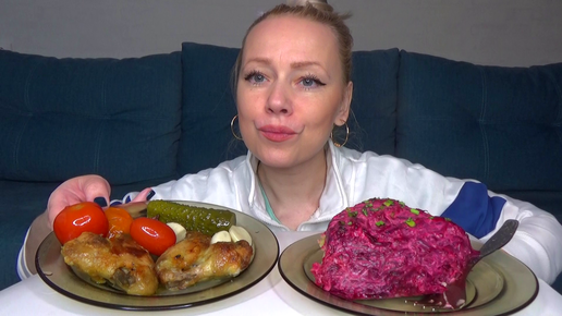 Салат Селедка под шубой, крылышки запеченные в духовке. Еда.