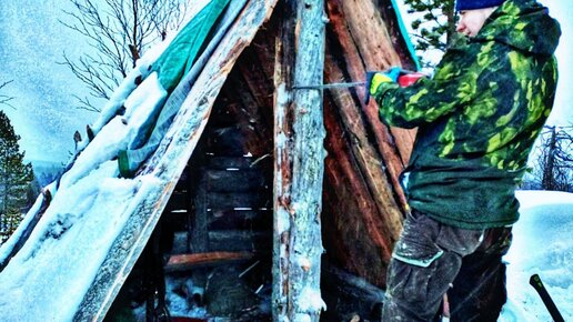 Изба строится - Зима продолжается. Устанавливаю каркас для двери. Ушёл в метель. Сломал снегоступы! Встретил стаю Куропаток