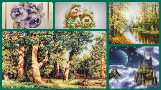Дубовая роща. Осень. Лунный замок. Лесная ягода. Ëжики в бруснике. Вышивка крестом.