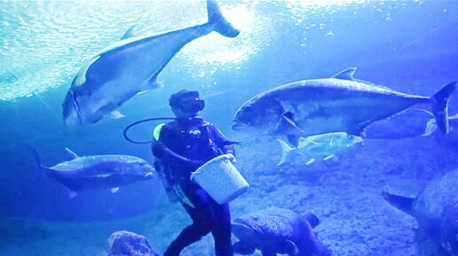 Кормление хищных рыб в океонариуме, Паттайя, Таиланд