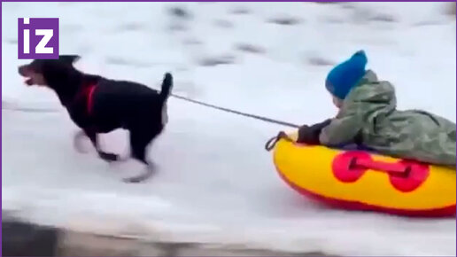 Опасное катание на тюбинге: собака мчит ребёнка по городу Сочи