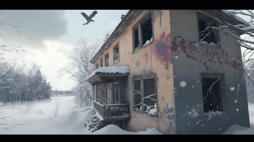 Заброшенный дом в зимнем парке. Голубь в конце сделал кадр