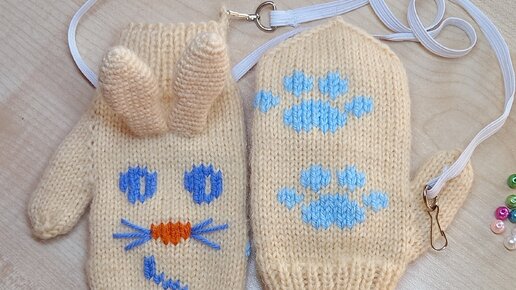 Варежки спицами на ребенка 1,5 - 2 года с заячьими ушками и вышитыми мордочкой и лапками, как связать смешные детские варежки спицами