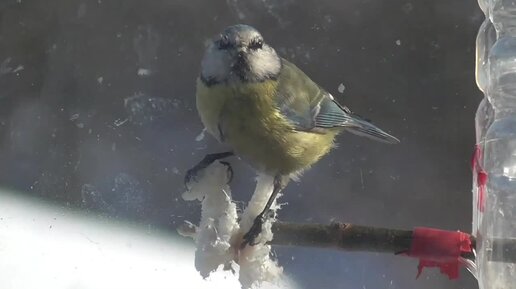 Синица лазоревка зимой у кормушки за окном. Кушает сало