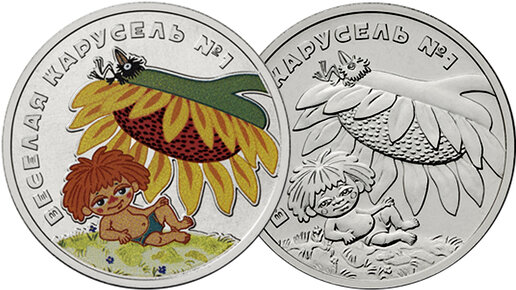 Две монеты 25 рублей Веселая карусель в обычном и цветном исполнении.