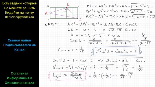 Математика Размер клетки 1х1. Найдите тангенс угла АВС.