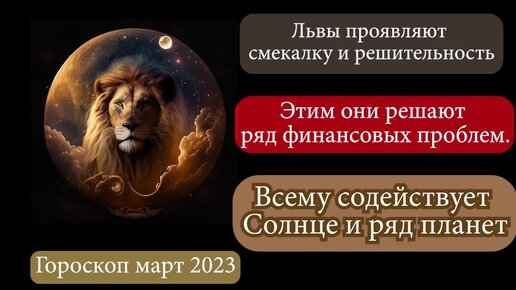 Гороскоп март 2023. Львы проявляют смекалку и решительность. Этим они решают ряд финансовых проблем. Всему содействует Солнце и ряд планет