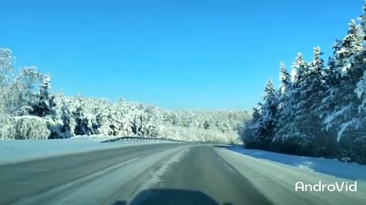 Микропоездка по дневной морозной дороге сквозь лесную чащу. Красота