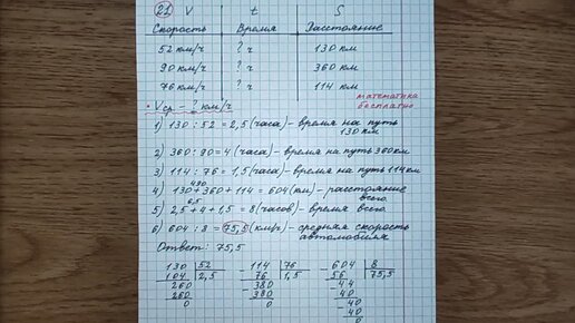 20) Первые 130 км автомобиль ехал со скоростью 52 км/ч, следующие 360 км - со скоростью 90 км/ч, а последние 114 км - со скоростью 76 км/ч.