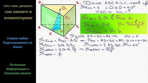Геометрия Боковая поверхность правильной треугольной призмы равна 6. Найдите высоту призмы, если прямая, проходящая через центр верхнего