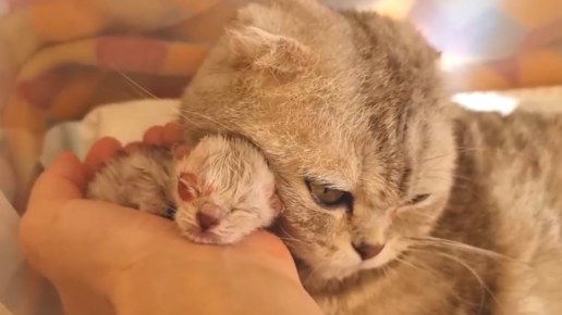 В первый час после рождения Котенок мяукает и не может найти грудь у мамы кошки