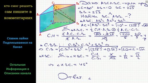 Геометрия Основанием прямой призмы ABCA1B1C1 является прямоугольный треугольник ABC, угол C = 90, AB = 10, BC = 2√5, высота призмы равна