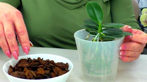 Маленькая орхидея 1.7 стала взрослой. Вырастила корни. Пересаживаю её из мха в кору.