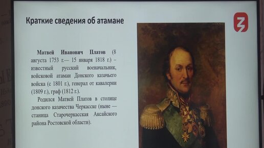 Лекция «Страницы биографии донского атамана, героя войны 1812 года Матвея Ивановича Платова»