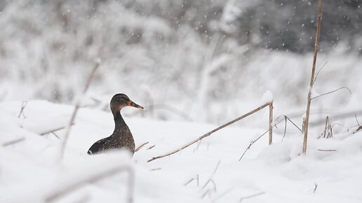 Наблюдение за птицами. Кряква на берегу в метель