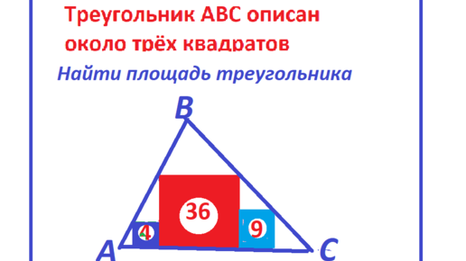 Найти площадь треугольника, описанного около трёх квадратов с площадями 9; 36; 4