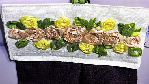 Кайма для полотенец с вышивка лентами «Розы и листья» + 4 комплекта домашнего текстиля: полотенца, салфетка и фартуки..