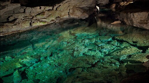 Большое подземное озеро в Кунгурской пещере. Здесь обитают таинственные рачки никогда не видевшие солнечного света.